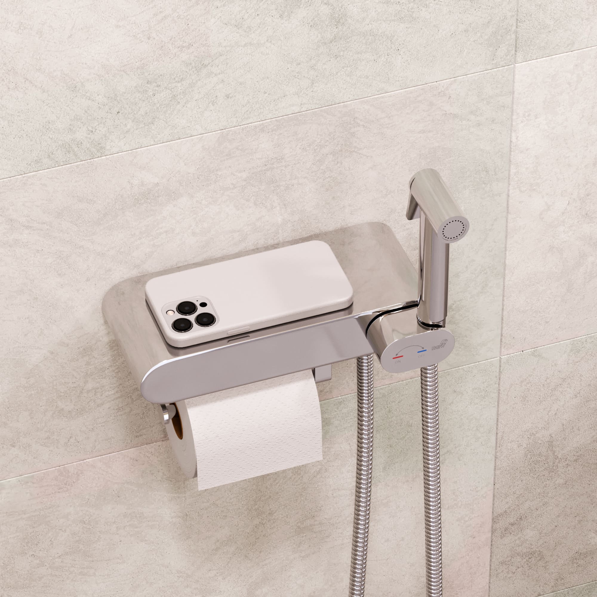Корпус смесителя гигиенического душа в этой модели выполнен в виде полки с держателем для туалетной бумаги/полотенца и полкой. Цельность конструкции смесителя с полкой — это важная составляющая долговечного использования.