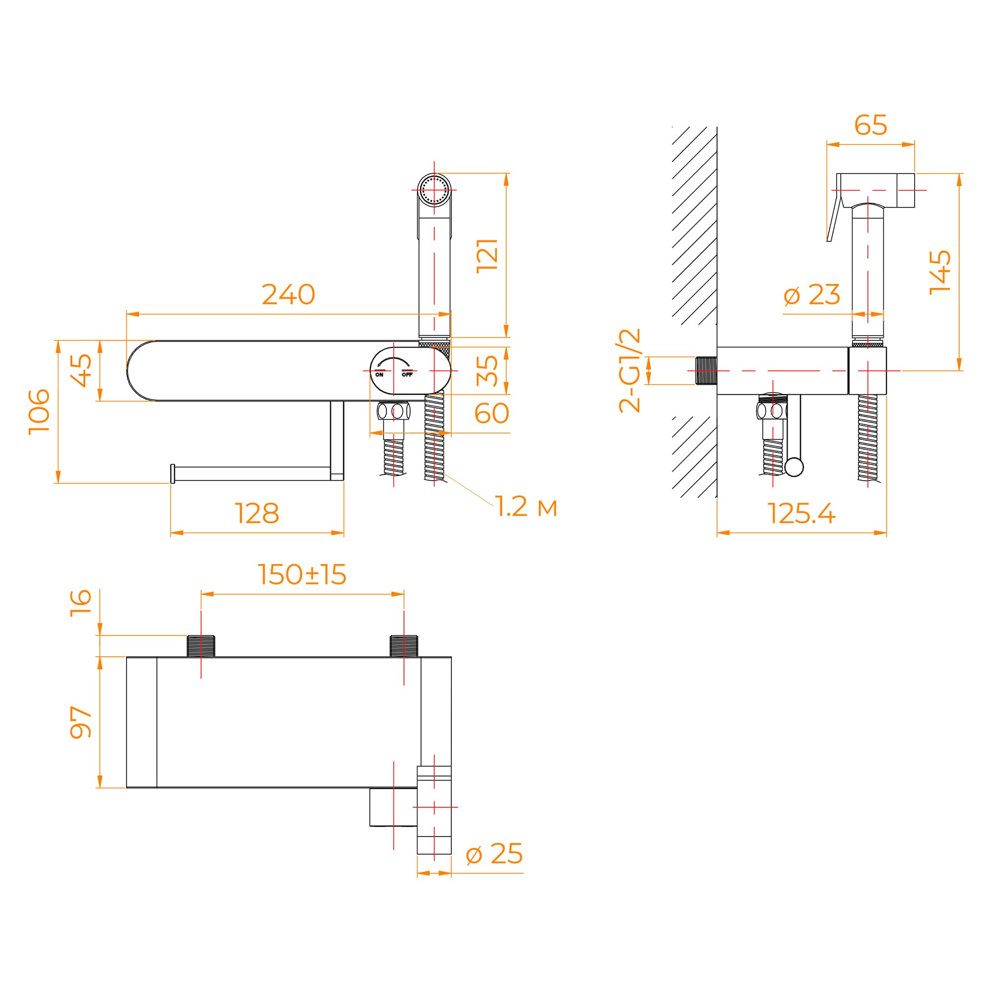 Установка гигиенического душа со смесителем — навесная на внешнюю часть стены. Сантехническое оборудование требует заранее запроектированного месторасположения. Требование к установке: месторасположение должно быть запланировано заранее, чтобы сделать подводку труб на этапе черновой отделки помещения. Рекомендованная высота установки 50 см от пола. В данном изделии смеситель имеет два монтажных входа с установкой на эксцентриках. Желательно при расчете установочного места правильно запроектировать его размещение согласно желаниям будущих пользователей, учитывая их особенности жизни и удобство пользования.