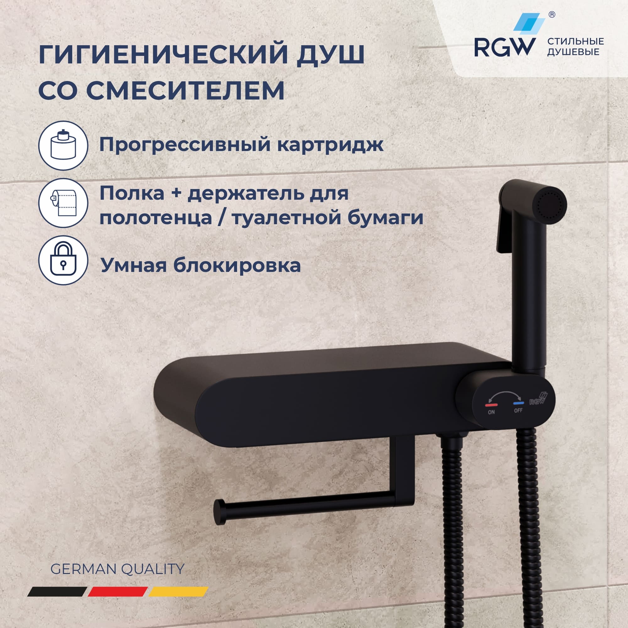 Стильный высококачественный комплект гигдуша RGW SP-222В в черном исполнении: смеситель с поворотным управлением с полочкой для телефона или мыла, с держателем туалетной бумаги или полотенца, душевая лейка со шлангом цвет - черный