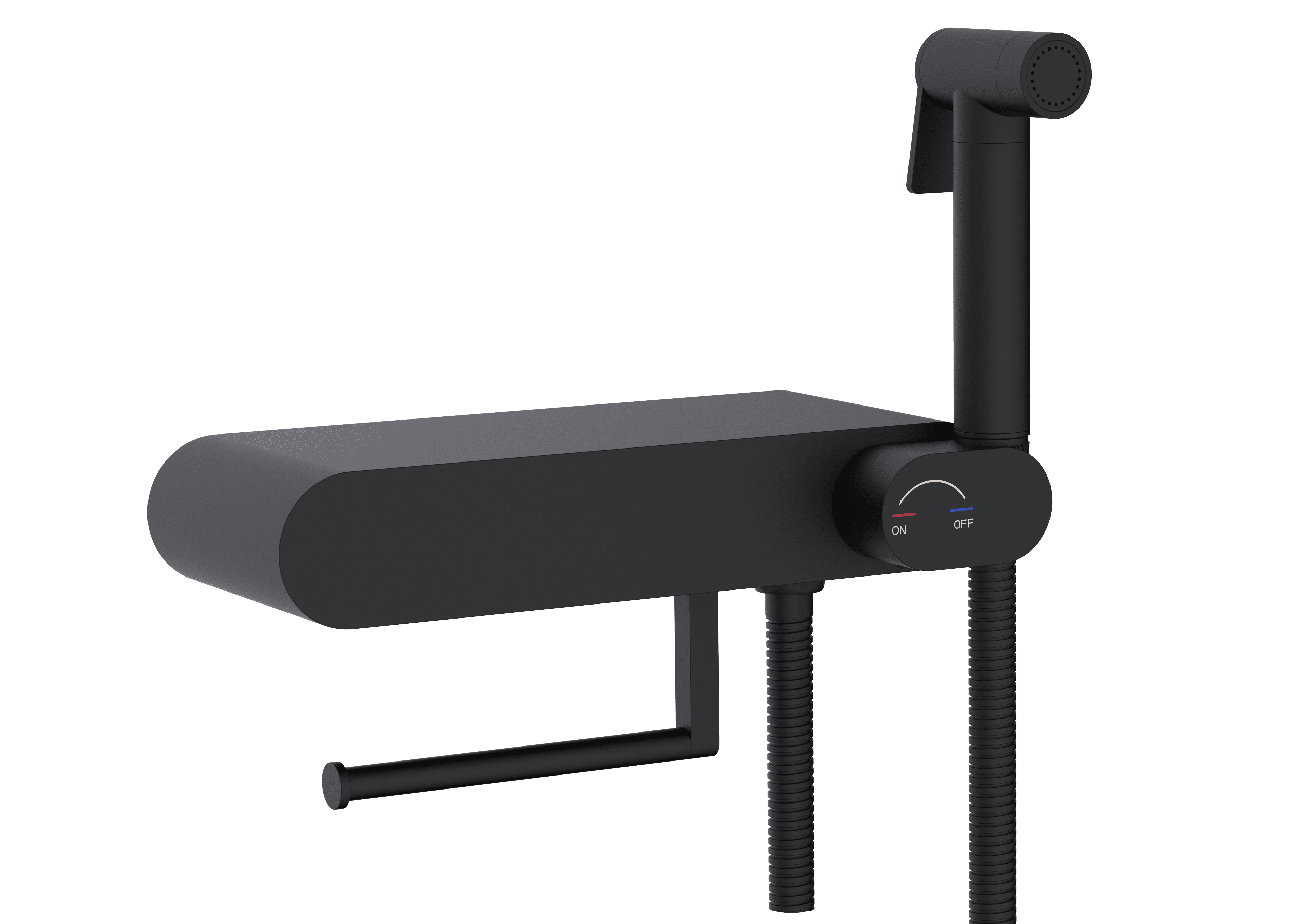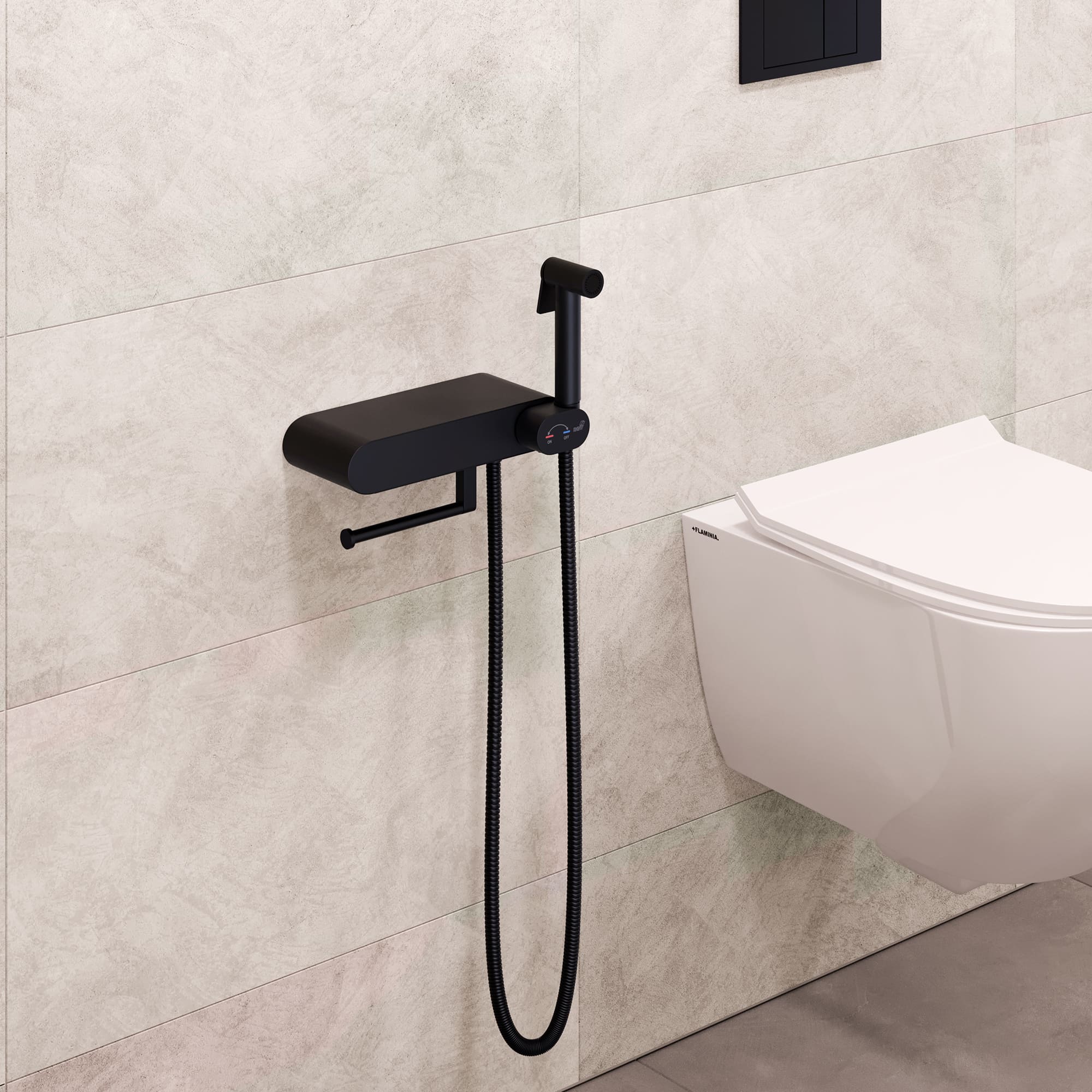 Корпус смесителя гигиенического душа в этой модели выполнен в виде полки с держателем для туалетной бумаги/полотенца и полкой. Цельность конструкции смесителя с полкой — это важная составляющая долговечного использования.