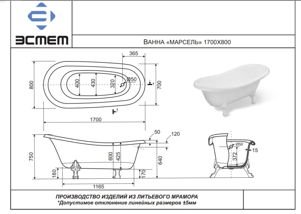 Ванна из искусственного камня Эстет Марсель 170х80 ФР-00001849