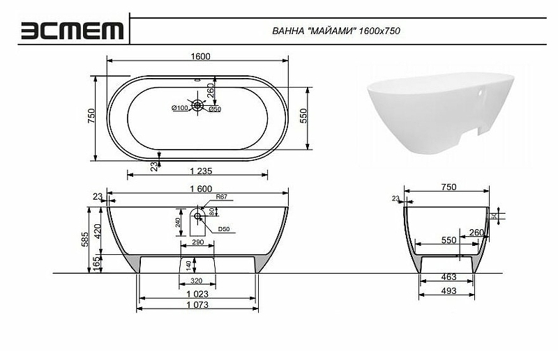 Ванна из литьевого мрамора Эстет Майами - это современное и стильное решение для вашей ванной комнаты.