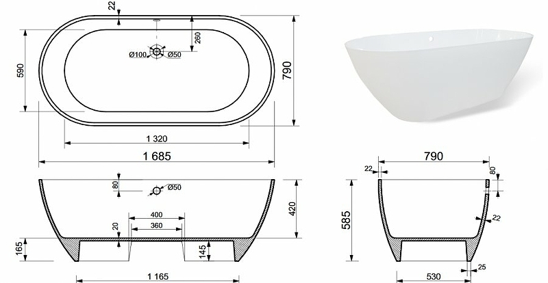 Ванна имеет овальную форму и размеры 168x78.5 см, что позволяет комфортно разместиться одному человеку. Высота ванны составляет 58,5 см, а объем - 280 литров.